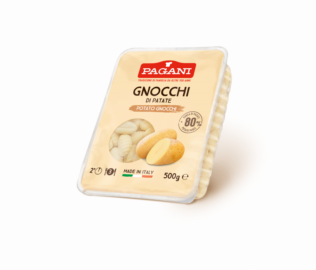 Pagani Gnocchi contain 80% of mashed potatoes, against 70% of most of the competitors: in fact, a higher content of potatoes processed directly on the farm is used in the production process, which also makes our Gnocchi more “yellow”. The special processing of the hot dough allows the Gnocchi to be softer and more consistent, not to stick to each other and to have an excellent cooking yield. Available in 500 g trays, Pagani Gnocchi can be stored out of the fridge for 12 months and are ready in just 2 minutes.